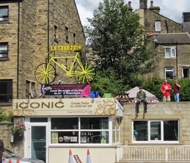 Then it was back on the train to travel to Haworth, which had also really gone to town. I went into the lovely local park which was not only full of interesting stalls, live music and souvenirs of the race, but a huge screen had been set up and hundreds were settled down and were watching the race! How fortunate the weather was so outstanding, which made this a really lovely event.Quite apart from all the bicycles which were absolutely everywhere, there were also a large number of red polka dots, which at the time rather puzzled me, but I discovered this on the web: