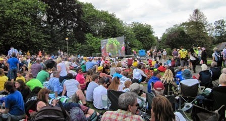 Then it was back on the train to travel to Haworth, which had also really gone to town. I went into the lovely local park which was not only full of interesting stalls, live music and souvenirs of the race, but a huge screen had been set up and hundreds were settled down and were watching the race! How fortunate the weather was so outstanding, which made this a really lovely event.