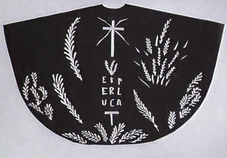 Something I didn't know was that in 1947, when he was in his late 70's, he was asked to design a stained glass window for the Dominican Chapel of the Rosary in Venice. He became so enthusiastic that he took on the total design project, even including this striking chasuble robe to be worn by the priest.