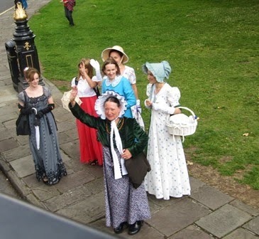 Once back in the city I had a welcome cuppa at Manvers Street church just opposite the bus stop, before climbing aboard once more for the City Tour, which was even more fascinating, as we wove our way around narrow streets, steep hills, and always near the soft golden architecture of the attractive buildings. Of course it would have been wonderful to have seen the famous Royal Crescent, but that is now closed to traffice, although it would have only been a short walk and a chance to visit No 1. But we did see another crescent, and were greeted by these customed figutes!
