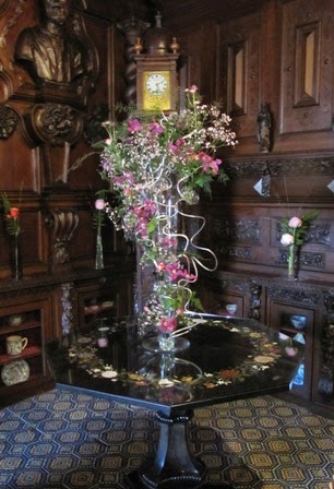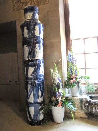 However, the arrangement that caught my eye the most, and was certainly the most memorable, if not the most attractive, was a matching pair of great orbits and cascading flowers either side of Damien's Hirst's incredible statue. Titled 'St Bartholomew, Exquisite Pain' it was created in 2006 especially for the Beyond Limits-Sotheby's annual exhibition of modern sculpture held at Chatsworth. I felt a great deal of thought had gone into this creation and it worked most effectively.