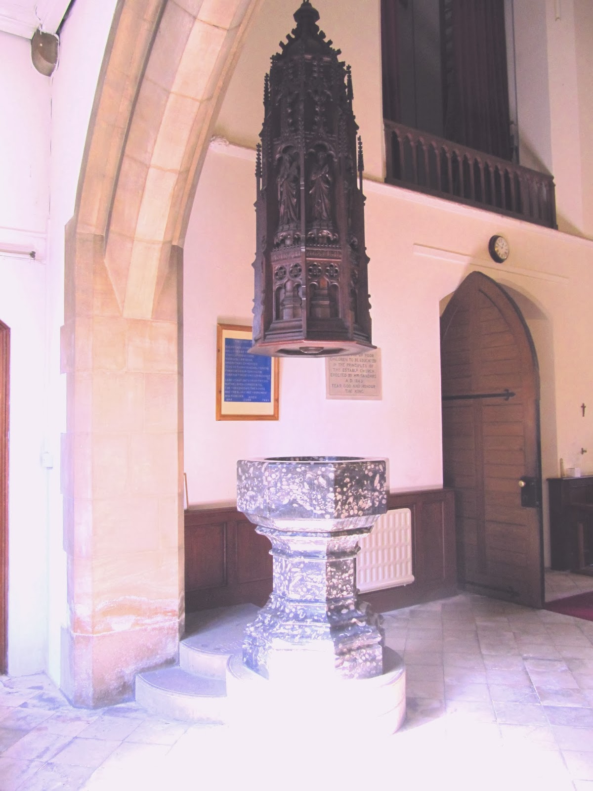 There was also an incredible font of Durham Frosterly marble with the most beautiful carved oak canopy depicting bible figures, which is