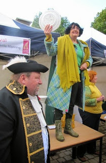 Then it was time for the auction, and what fun that was! I just loved the way they stood Anita, with her amazing green boots, on top of a table because she is so small the crowd couldn't see her! With her in this picture is Henry the excellent Town Crier. He'd already explained to the crowd that all the money raised would go to the Mayor's Fund, that this year is being used to finance the travel cost of patients with cancer requiring treatment in Sheffield (To see her in action just click here) Afterwards I'd wished I'd done more bidding, so now I can't wait to see if they're going to do it again next year!