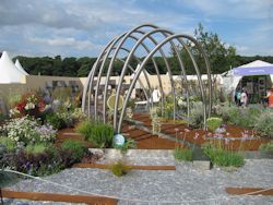In the show gardens it was impossible not to be impressed by 'A Stainless Century' which celebrated the invention of stainless steel and the impact it had on the city of Sheffield and the wider world. The central water feature represents the flow of molten metal, and the steel sculptural arches depict the curved roof of the lovely Winter Garden (see previous blog)