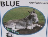 'I was rescued from Cyprus along with my best friend Sky when we were 3 months old. My mother had been thrown over a cliff and killed (the common fate for unwanted animals in Cyprus) leaving me heartbroken and terrified alone with no milk to keep me alive. Martin Shaw & Jenny Seagrove met us at Manchester Airport on arrival but I had never seen grass or very many donkeys so arriving at Donkey Village was very frightening. Sky and I feel more like brothers and we often play fight together. I am very affectionate but I will try to explore your bags. I love ginger nut biscuits added in my bucket feed.'This is Blue