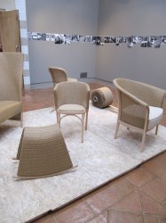 Upstairs the exhibition continued showing what happened when 5 designers, in June 2012, visited the closed Lloyd Loom factory in Spalding, Lincolnshire. Using the factory machinery and their signature weave (I'd forgotten Lloyd Loom is basically brown paper spun round wires), over 2 days, 13 completely new concepts were developed. These were left in the factory showroom for the staff to find on Monday morning - and what a lovely surprise they must have had!Several of these pieces are to go into production, and certainly all our tour group loved them and were anxious to know when they would be available in the shops. I've e-mailed Lloyd Loom for some dates, but so far have received no reply.