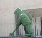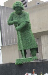 These two figures, with the tallest standing some 23 feet tall, represent an old woman and a young boy and have been dubbed The Sweepers. They were made to celebrate the community spirit that followed the London riots two years ago, when neighbours helped each other by sweeping up the mess. Each has a metal pole through the bodies to keep them upright, and are made by internal scaffolding supported by timber. This has been encased in chicken wire before being decorated with artificial topiary.