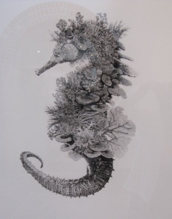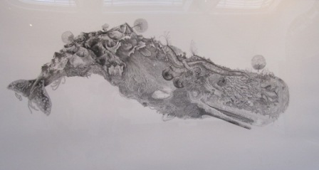 When I first walked in and saw black and white drawing that are so fine that a magnifying glass had been provided by each one, I was a little unsure. Initially they look so strange and unfamiliar. Just the outline was recognisable - for example this humpback whale.However, it all became so much clearer on viewing this video, featuring this delightful young artist.