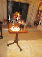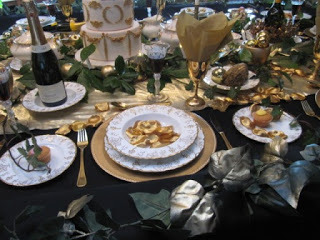 Up at the the top of the Hall, in an area I don't think is usually open to the public, was a most splendid room, with impressive sky lights, a bay window overlooking the gardens, and another roaring log fire. Here a most splendid banquet had been laid out, just dripping with gold! What a feast!!
