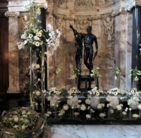 One of the most breathtaking rooms had to be the Chapel, with it's sombre statue of St Bartholomew by Damien Hurst. At first glance it is just a white arrangement, contrasting with the dark of the statue. However, on closer inspection there are leeks up the sides of the uprights, and cauliflowers along with the orchids! In fact I could have sat in the lovely space for hours and studied such a clever display, and really working out how everything is both attached and watered.Beyond the Dining Room, with its masses of orchids, always a firm favourite of mine, you enter the spacious and lighter Sculpture Gallery, and here the arrangements were in scale with the monumental pieces of marble, and looked just wonderful.