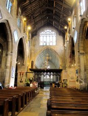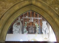 The amazing ceiling in the chancel was repainted during Sir Charles Nicolson's 1929-33 restoration, and the fine reredos was erected in memory of a 17 year-old boy who accidentally drowned in 1879. There are 57 individual saints in addition to the Apostles on each side of the Crucified Christ.
