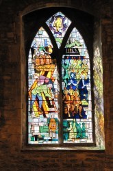 A particular interest of mine is stained glass windows, and this church had some really interesting ones. This one is part of a pair of modern windows installed in 1966. On one side it shows local agriculture, including the growing of tulips, such a feature in this part of the country.