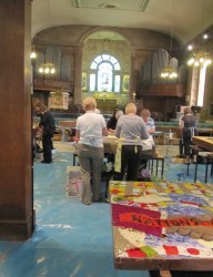 Inside the church the middle area had been completely cleared, and the floor covered with plastic. Everywhere volunteers were bent over boards hard at work, with only a couple of hours left to complete each complex design.