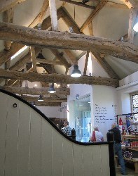 These include the Great Barn Restaurant which is certainly different from eating in the Old Kitchen, which, whilst very atmospheric was cramped and crowded, with seating mainly on long wooden benches. (You certainly got to know your neighbours I always found!). The new restaurant is so spacious and clean, with a clear serving area with cakes etc on display, with plenty of room for wheelchair users, or pushchairs. Upstairs there is some additional seating, giving a clear view, and with the most striking original beam work. Outside there is a large patio area, with stunning views across the lovely Derbyshire countryside.
