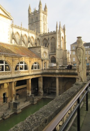 Almost immediately you step in to a walk way where you look down onto the greenish water of the bath. The hot water spring rises at a rate of 1,700,000 litres each day at 46 degrees centigrade. It bubbles up into the King's Bath which was built in the 12th cenytury AD. Beneath the King's Bath is a reservoir built by Roman engineers who usedthe hot water to supply the baths. The Romans also used two smaller hot springs nearby. Just incredible.