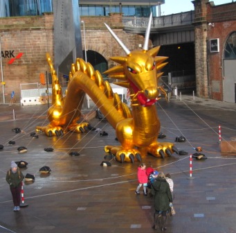 Not far away, but actually in Salford, was the most gorgeous inflatable 50ft golden Chinese Dragon, situated in Greengate Square, which is just across from Manchester Cathedral. Who couldn't love it?