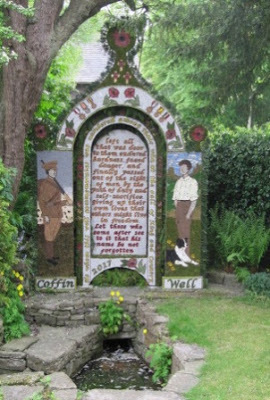Here are my pictures, which I think you will agree show just how much work and thoughts goes into these amazing creations every year. This is the one directly opposite the impressive Hall which has been in the hands of the FitzHerbert family since the reign of Elizabeth I. Today the Estate consists of 10 farms, 40 cottages and miscellaneous lettings. Everyone in the Village contributes in some way to the dressing of the Wells whether by digging the clay, picking the flowers or helping to put up the dressings on the Wednesday evening. This is the design opposite the Hall.