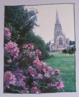 However, my absolutely favourite, and yet probably the most simple piece of work in the exhibition is this lovely picture by Jenny King from the North Nottinghamshitre Creative Textile Group based at Retford. It is simply called 'Clumber Chapel'. Apparently it started as a simple photo of the area, which was then transferred onto the fabric, rather like printing a T-Shirt! Then the picture was enhanced with the addition of stitches and tiny pieces of pink material. Just stunning!
