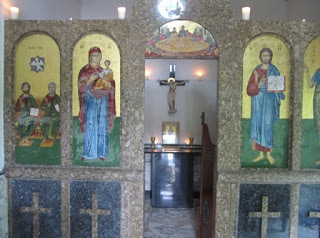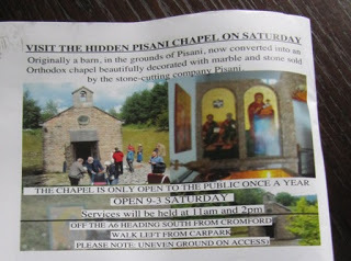 It turned out to be within the Pisani marble works off the A6 heading south from Cromford. It involved an uneven path away from the works, and then suddenly there was this tiny little building. Afterwards I was fortunate enough to have a conversation with the Greek Orthodox priest and he said when the Pisani family started here they saw a small farm barn abandoned at the end of their land, and decided to turn it into a private chapel. He said Greek Orthodox families often converted rooms or outbuildings to accommodate their religion if there was no church nearby.The chapel was certainly small - holding only a handful of people, all standing of course as in the Eastern tradition, but full of the most beautiful icons, paintings and candles. It was divided into a separate section for the chancel end, and what I would call the nave. I thought it quite breathtaking.