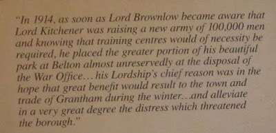 This panel particularly made me laugh. Washing 18,000 articles of men's clothing was a real problem until some patriotic local ladies intervened. They devised a scheme to pay local women 3½d (about £1.05 today) for washing one man's set of clothing. The women were allocated 24 sets and so received 7 shillings (£24.47 today) from the Grantham War Distress Committee which was reimbursed by the military authorities. However, the scheme didn't start well with 168 articles being lost in transit and complaints of clothing coming back freshly infected with lice.The most shocking panel was the last one which stated that "At 11am on 11 November 1918, over 5 years since it began, the First World War came to an end. Approximately 8.5 million British men had been mobilised, over 2 million were wounded and almost 1 million never returned home to their families. Amongst these were 14,500 men who had trained on Belton Park before going out to the frontlines, never to return home."