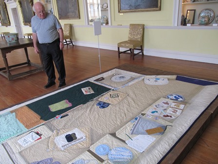 Another excellent and interesting quilt was called 'The Sleep Quilt'. In the noisy, light-ridden prison environment, a good night's sleep is the stuff of dreams. It was commissioned for an exhibition entitled 'Things we do in bed', held last year at Danson House in Kent and curated by the well-known author, Tracy Chevalier. Over 60 men and 2 women from nine prisons contributed blocks which were assembled at HMP Wandsworth. Most of the quilting was done by one man in his cell at HMP Brixton who, to ensure the quilt was completed on time, often stitched for ten hours a day.With this in mind, 'Cell Quilt' was very interesting. To help customers have a better understanding of the reality of prison life and the provenance of their products, one of Fine Cell Work volunteer tutors at HMP Bullington, suggested to her group that a life sized quilt should be made, giving a bird's eye view of life behind bars. Permission was granted to take measurements of a two man cell and its regulation and personal contents. I spent ages looking at this fascinating quilt.
