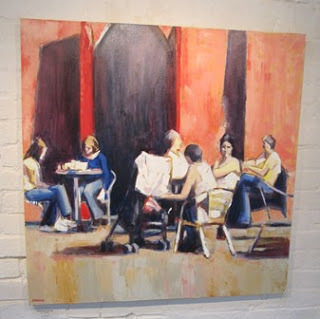 The show is upstairs above the restaurant - an attractive, well-lit area which really showed the paintings off at their best.I was pleasantly surprised how different Joel Wareing's style was to his father's, but still very skilled and attractive. According to the accompanying leaflet he focuses on body language and the interaction of people within urban environments. Paintings are made from sketches and photographs taken on location and created out of a desire to translate an atmosphere within the painted image. Paint is used as a way to get closer to an actual experience of a place, a vehicle for transferring emotions that a photograph might not give you. A really interesting concept I thought.