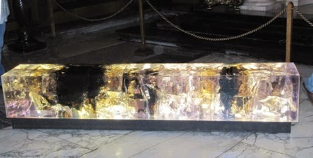 Inside the surprisingly small Cathedral there was a warm welcome, and to my considerable delight, an organist immediately started playing, really adding considerably to the atmosphere, and the sheer enjoyment of the experience. The tomb itself is very simple being made from a two-tonne block of pale Swaledale fossil limestone, with a deeply incised cross. (I found it fascinating that, like most visitors, I just had to touch the cool stone and look for fossils!) The dark plinth is made from Kilkenny stone.