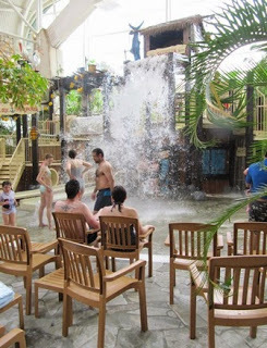 For one thing it seemed much smaller, and there was no large central pool, so there would have been nowhere for an adult to swim. In fact it was divided into a number of smaller areas, all quite child orientated, with a lot of wooden chairs for parents to watch their offspring. There were also a number of food outlets selling the inevitable chips etc and soft drinks.One area that was very popular was pirate-themed, and every so often, and it seemed random, there would be a great rush of cascading water, which was proving very popular with the 'victims' waiting, bated breath, underneath.