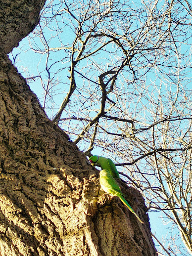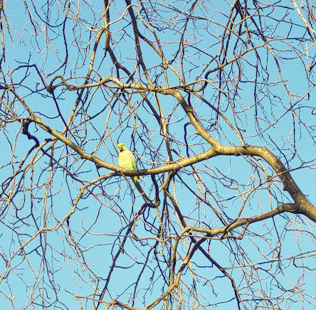 Anyone lost a parrot? Or two parrots? They're actually ring-necked parakeets, usually only seen in southern England, but occasionally seen elsewhere if escaped from captivity.