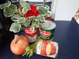1 can Campbell’s Chicken with Rice soup 1 can stewed tomatoes 1 med. onion, chopped ½ stalk celery,chopped Dash salt to taste Dash dried oregano1 small can corn kernels1 small can green peas
