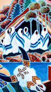 acrylic painting by Linda Lee GreenePaulette welcomes me into her kitchen and then very graciously explains that embracing the Christian tradition is a thorny issue for many of her people given the injustices that America’s indigenous people have faced under white domination, both in the past and the present. Even so, the good spirit of the season permeates her culture in admirable ways. “You showed up just in time to catch me before I leave for a meeting of the Partnership with Native Americans (PWNA),” Paulette informs me. Responding to the quizzical look on my face, she continues. “We spread holiday cheer in the way of blankets, nutrition and education services, medical screenings, and more to over 30,000 of our Elders, children, and families in approximately 110 reservation communities here in the Northern Plains and the Southwest. Winter is brutal in these reservations and rural communities, and we work hard to come together in the spirit of giving at this special time.” Upon making my exit into a frozen morning, I drop a couple of Andrew Jacksons into Paulette’s PWNA donation basket and cringe at the gruesome symbolism of that particular face being imprinted on those U. S. $20.00 bills.