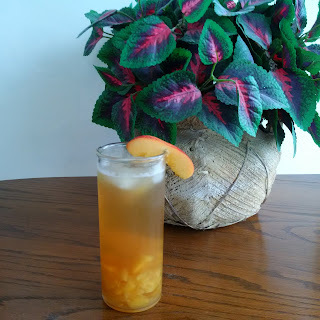 Garnish the glass edge with the unpeeled fruit and drop a fresh sweet cherry with the stem on into the top of the tea.