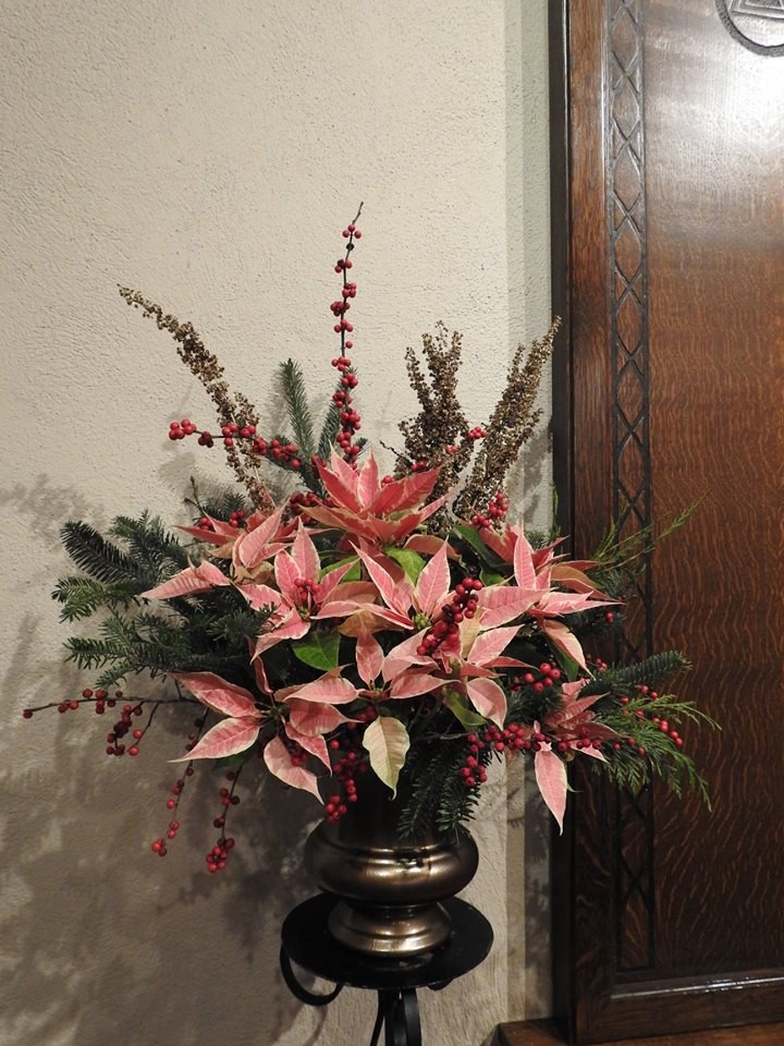 The last one is a pale pink mixed with dried dock and milk weed pods, the red berries tucked in here and there with a brass colored vase. I’m particularly fond of this one. Christmas bouquets need not always be red to be lovely.