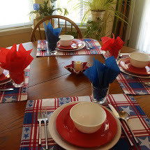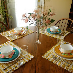Having said that, I decided to challenge myself and my overabundant dish fetish. Instead of using a complete set of one of the ten dish setting I have, could I create four seasonal table settings using only four white dinner plates, 8 solid primary color luncheon plates, and 8 assorted bowls and 4 clear glasses?