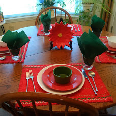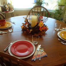 With no patterns in the dishes to help set the seasonal mood, I decided to use patterned placemats. Placemats take up less storage room than dishes and cost less to replace if they get stained or you just want a change. Seasonal paper napkins and decorative elements gathered from around the house for centerpieces rounds out the table. Since white contrasts best with colored or patterned placemats I used the white dinner plates as the base for the place settings.