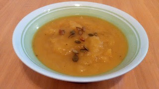 Remove the squash from the oven and add to the broth. Simmer for 10 minutes. Remove from heat. Using a regular or immersion blender, puree the soup until smooth. Serve warm. Top with pepitas if desired.