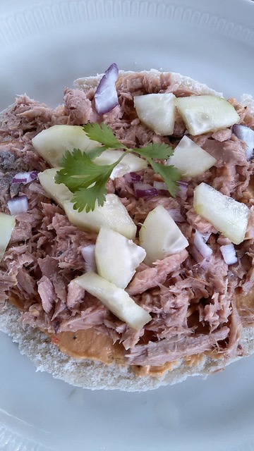 SPLIT pita in half horizontally so there is a top and bottom. Spread each half with hummus. Top with tuna salad. Garnish with remaining cucumber and parsley. Enjoy!