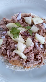 DRAIN tuna then scoop into a bowl. Mix in lemon juice, onion, most of the cucumber, chopped parsley, and raisins.