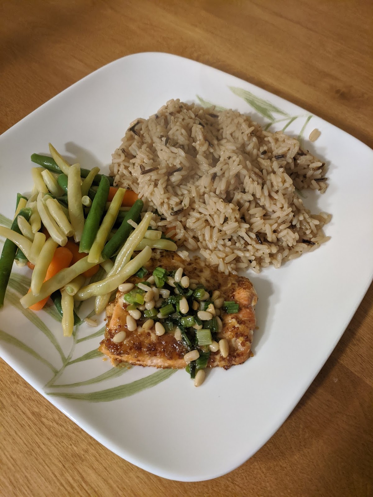¼ cup (30g) brown sugar¼ cup Dijon mustard½ tbsp. (10ml) white wine2 tbsp. (30ml) butter 1 tbsp. pine nuts3 scallions/green onions, sliced, be sure to include much of the green