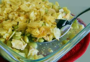 PLACE all ingredients except chips in an 8x8 pan. Mix well.