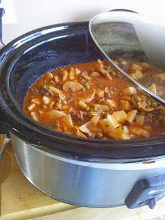 ADD the canned vegetables, potatoes, tomato soup, drained ground beef, and seasonings into the crock pot.