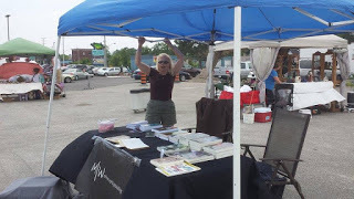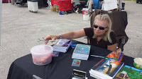 1. Usually potential customers (a.k.a. readers) are lured to tables when they see books. That’s a no-brainer. Make sure you have an eye-catching banner running across the length of your table and that your books are strategically placed in stands (you can purchase these at any dollar store) and positioned together in the same genres.