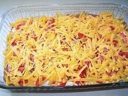 LAYER as follows: chopped red pepper, chopped green pepper, chopped tomato, chopped green onions, and then top with shredded cheese.