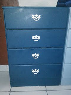 See they're made of pressed board with wood grain paper over it. Not exactly high quality. I hate fake wood so I painted them (of course). I don't have a before pic but lets just say this poor dresser was a sad, sad sight. It was a pale blue with gold handles...oh except for one drawer that was a strange beige color. Don't ask, I don't know how that happened. Anyway, after a coat of Bulls Eye Primer (seriously, this stuff is amazing! You can paint ANYTHING with it), three coats of some blue oops paint I picked up somewhere, and some spray paint, this is what I ended up with: