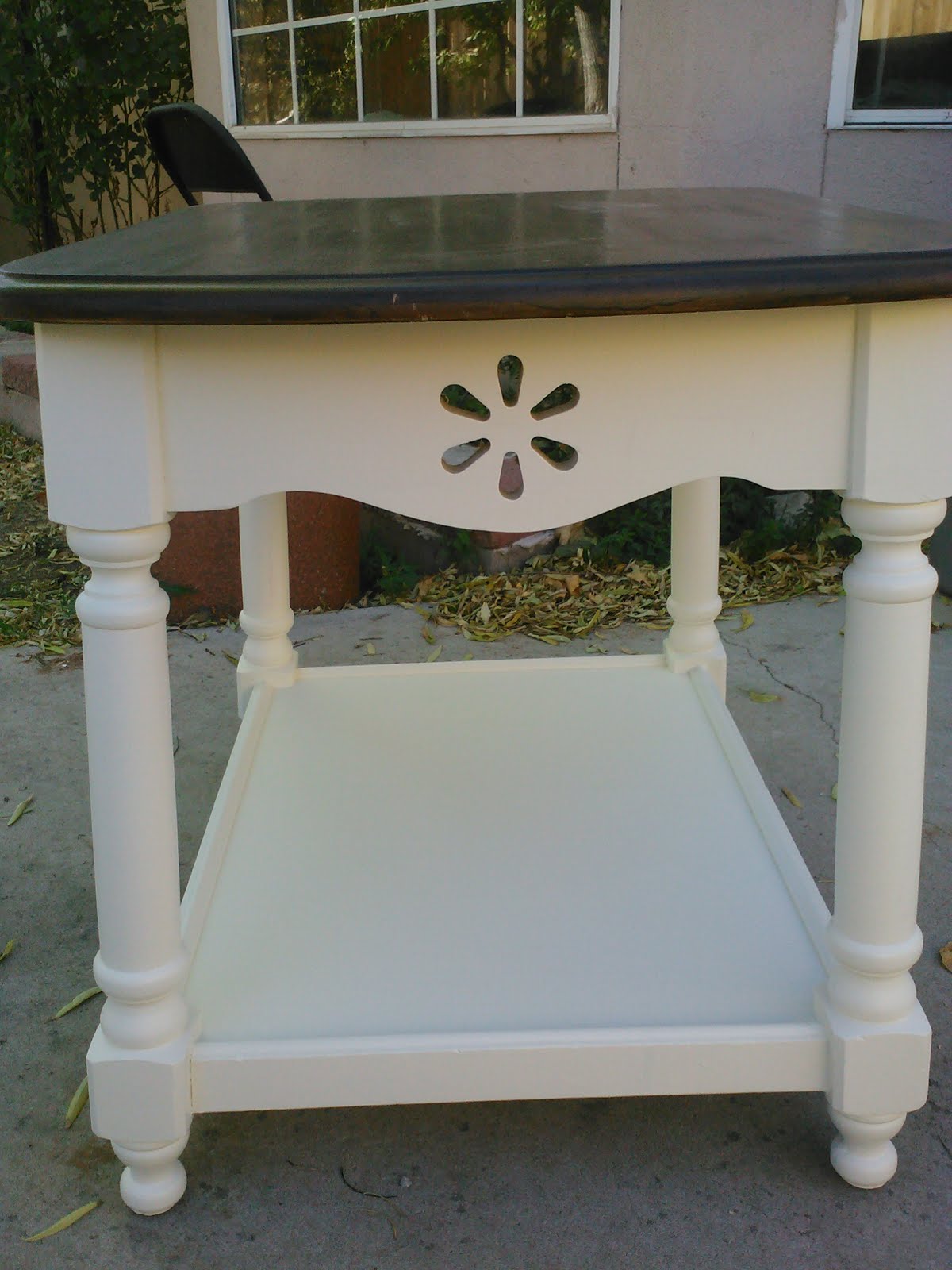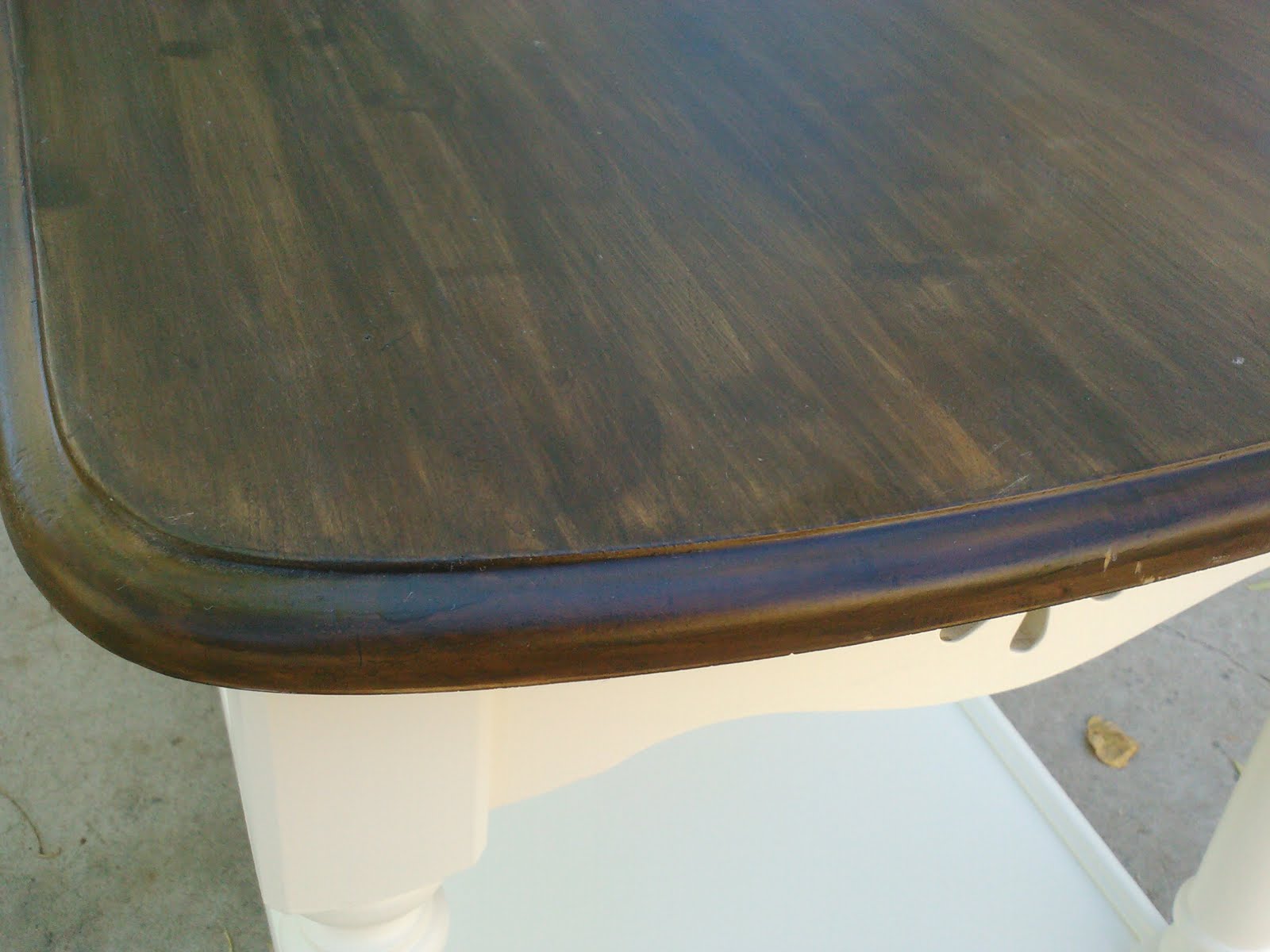 Anyway...after MUCH sanding and I do mean A LOT of sanding and multiple coats of stain, not to mention primer and new paint. This is what I ended up with. I think it turned out pretty nice. I love dark wood with white/off white paint. Unfortunately around here dust is a wayof life. It's not uncommon to have dust storms and it's impossible to keep dark furniture clean. Oh well, we all pay a price for beauty, right?