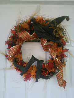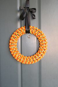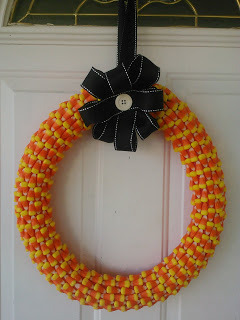 Partly because I just thought it was so cute...partly because my husband thinks candy corn is an abomination to mankind! Mwahahaha (yes, that was my pitiful attempt at an evil laugh)! My oldest, who loves it, was horrified, but that's okay, he got all the broken ones I couldn't use. I ended up using a pool noodle (also an idea from pinterest) and didn't wrap it in ribbon before I started. If I were to do it again I would. However, I like my bow better and don't mind that it's slightly oval shaped.