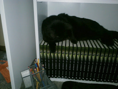My husband snapped this picture of the kitty (Sirius Black) (hehe!). I had just lined up a lovely row of hardbacks when he decided he had to check them out. He is my constant companion when I write, always curled up on my feet.