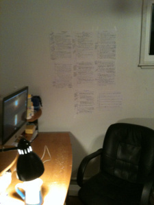 The picture you see captures some brainstorming going on. I addressed all my major characters, and a couple minor ones, and asked them two things: what do they want most, and how are they gonna get it? All those scribbles answer them, and from that a third book will be born. More pages are to come, but they will most like get stuck in a notebook, instead of taped to the wall. I’m running out of space and I have a kitten that would shred them off the wall. Those eight pages you see are hopefully out of the danger zone, the path to the window.