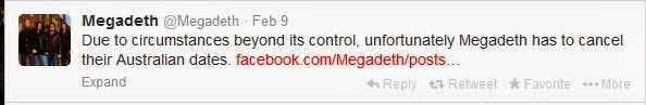 I'm siding with the Australian fans on this one. I'd be pissed off and angry as well. And, on their behalf, I am. I'm a minimum wage worker who's glad to have a job in these tough times. Concerts are one of the ways I relieve some of the pressure and to have years of loyalty and love thrown back in your face because of something so stupid is downright offensive. And if Megadeth's current behaviour continues, then the show I'm going to see in April will be the last one. There'll be no more merchandise, no more albums, and no more concert tickets. I can think of bands far more worthy of my money than one who doesn't have an ounce of respect for their fans (and before anyone starts, yes, I know this may be “typical Mustaine behaviour” but it's still piss poor and uncalled for).
