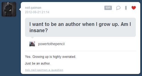 Writing is all about having fun. You get to create the dreams that others only dare think about. And if Neil Gaiman says you never have to grow up then you take that advice and run with it.